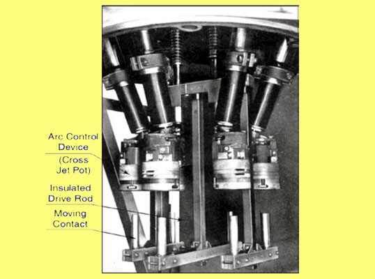 BOCBs usually have a metal top dome, through which six bushings pass to connect into the system, and the arc control devices, generally of the form illustrated in the image., are attached to the bottom ends of these bushings. The moving contacts are then arranged on a bridge, which, in turn, is fastened to an insulated drive rod. A removable tank containing the insulating oil is bolted to the dome.